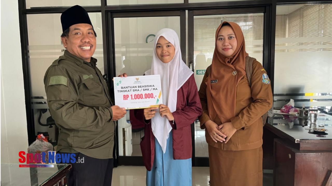 Mojokerto,Spotnews.id- Dua siswi berprestasi dari Kecamatan Dawarblandong kembali mendapatkan dukungan pendidikan melalui Program Beasiswa SLTA Badan Amil Zakat Nasional (BAZNAS) Jawa Timur. Bantuan sebesar Rp1 juta per semester tersebut diserahkan langsung oleh H. Samiadi, Wakil Ketua I Bidang Pengumpulan BAZNAS Kabupaten Mojokerto.