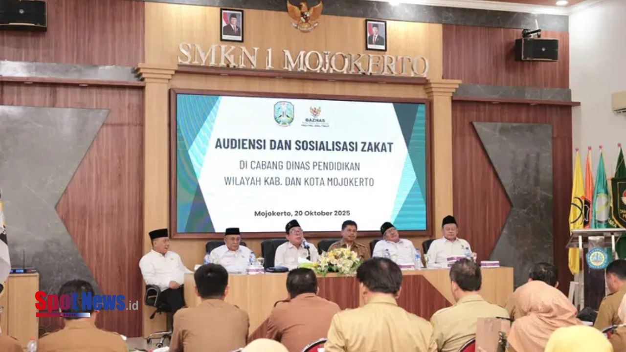 Mojokerto,Spotnews.id- Dalam rangka memperkuat kesadaran dan optimalisasi potensi Zakat, Infak, dan Sedekah (ZIS) di kalangan Aparatur Sipil Negara (ASN), Badan Amil Zakat Nasional (BAZNAS) Provinsi Jawa Timur menggelar sosialisasi ZIS di Cabang Dinas Pendidikan (Cabdindik) Wilayah Kabupaten dan Kota Mojokerto, bertempat di SMKN 1 Mojokerto, pada Senin (20/10/2025).