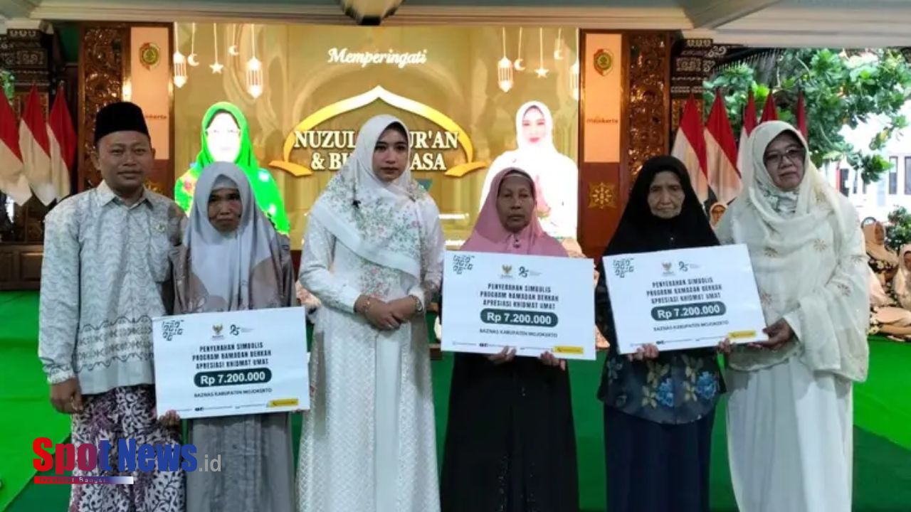 Mojokerto,Spotnews.id- Badan Amil Zakat Nasional (BAZNAS) Kabupaten Mojokerto memberikan apresiasi kepada 36 perempuan yang selama ini dikenal istiqomah mengabdikan diri untuk umat melalui Program Berkah Ramadhan dengan total bantuan senilai Rp7.200.000. Penyerahan apresiasi dilakukan secara simbolis oleh Bupati Mojokerto, Hanna Al-Barra, dalam rangkaian peringatan Nuzulul Qur’an dan buka bersama yang diselenggarakan oleh PC Muslimat NU Kabupaten Mojokerto di Pendopo Graha Majatama pada Minggu (8/3/2026).