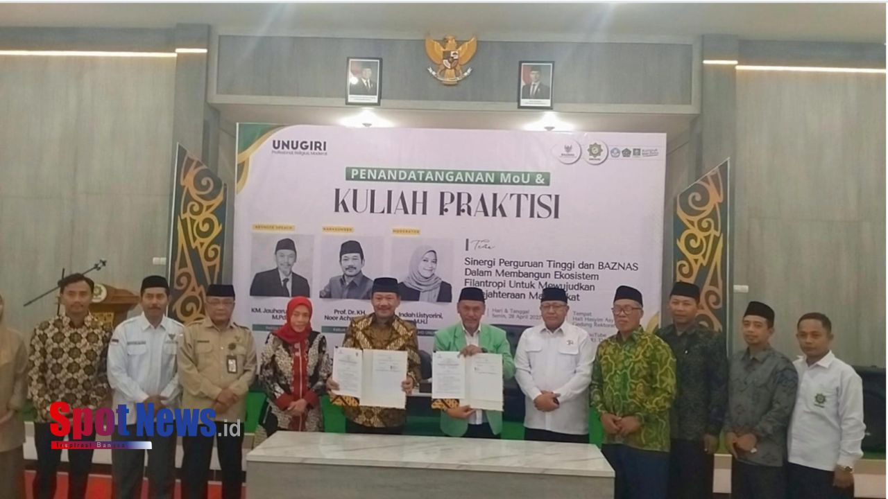 Bojonegoro,Spotnews.id- Badan Amil Zakat Nasional (BAZNAS) Kabupaten Bojonegoro bersama BAZNAS Provinsi Jawa Timur dan BAZNAS Republik Indonesia resmi menjalin kerja sama strategis dengan Universitas Nahdlatul Ulama Sunan Giri (UNUGIRI) Bojonegoro melalui penandatanganan Nota Kesepahaman (MoU) dan penyelenggaraan Kuliah Praktisi, pada Selasa (tanggal disesuaikan), bertempat di lantai 3 Gedung Rektorat UNUGIRI.